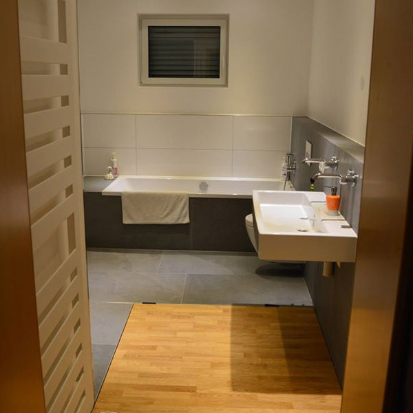 Umywalki Znane serie, takie jak V&B lub podobne, które są często używane . Prosty brodzik z odpowiednią wysokością wejścia (14cm). Przegroda prysznicowa z przeszkleniem w całości w ramie. Armatura natynkowa z prysznicem ręcznym. Wanna standardowa ok. 170 x 75 cm wykonana ze stali emaliowanej. Tak zwana wanna w kształcie ciała doskonale nadaje się do kąpieli, ale nie jest to najlepsze rozwiązanie, jeśli chcemy również wziąć prysznic w wannie. Klasyczny podgrzewany grzejnik na ręczniki. Proste szafki podumywalkowe, często z drzwiami i bez szuflad. Szafki lustrzane z dołączonym oświetleniem.