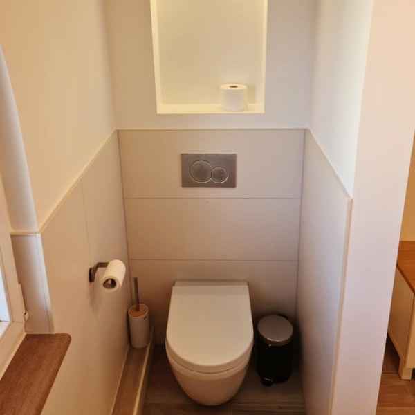 Prosta toaleta ścienna z prostym plastikowym przyciskiem spłukującym. Z reguły toaleta ze standardowej polki, tj. ma zakamarki i randy, które nieco utrudniają czyszczenie.